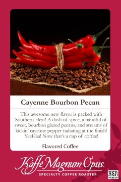 This awesome new flavor is packed with Southern Heat! A dash of spice, a handful of sweet, bourbon glazed pecans, and streams of kickin’ cayenne pepper radiating at the finish! YeeHaa! Now that’s a cup of coffee! |