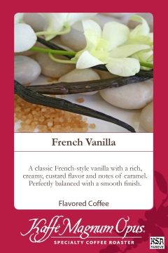 French Vanilla Flavored Coffee: a classic French-style vanilla with a rich, creamy, custard flavor and notes of caramel. Perfectly balanced with a smooth finish.