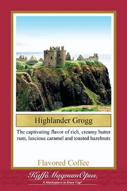 Highlander Grog Flavored Coffee: the captivating flavor of rich, creamy butter rum, luscious caramel and toasted hazelnuts.