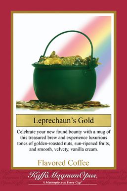 If you want to reach the pot of gold at the end of the rainbow, hold onto your elusive little friend tightly. Celebrate your new found bounty with a mug of this treasured brew and experience luxurious tones of golden-roasted nuts, sun-ripened fruits, and smooth, velvety, vanilla cream. |