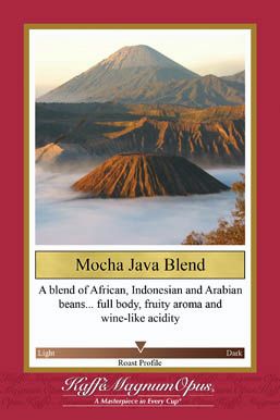 A blend of African, Indonesian and Arabian beans... full body, fruity aroma and wine-like acidity.