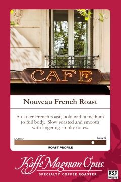 A darker French roast, bold with a medium to full body. Slow roasted and smooth with lingering smoky notes.