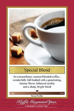This was first put together by our founder in 1992 and has been a top seller ever since. An extraordinary custom-blended coffee --- wonderfully full-bodied with a penetrating, intense flavor, balanced acidity and a sharp, bright finish. |