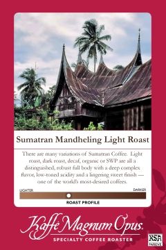 There are many variations of Sumatran Coffee. Light roast, dark roast, decaf, organic or SWP are all a distinguished, robust full body with a deep complex flavor, low-toned acidity and a lingering sweet finish -- one of the world's most-desired coffees. |